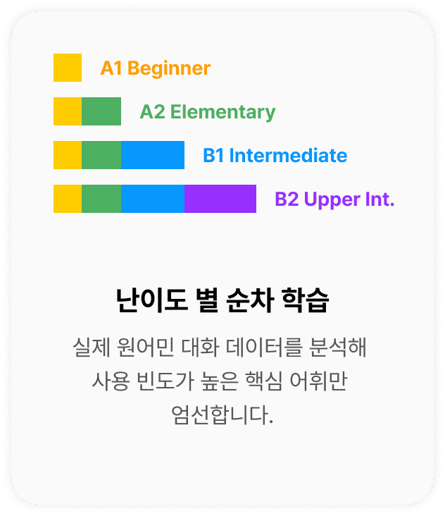 단어 암기는 '얼마나 많이'가 아닌 '무엇을' 외우는지가 중요합니다. 톡이즈 보카는 일상 회화의 95%를 차지하는 핵심 3,000단어에만 집중하여, 최소한의 노력으로 최대의 효과를 이끌어냅니다.