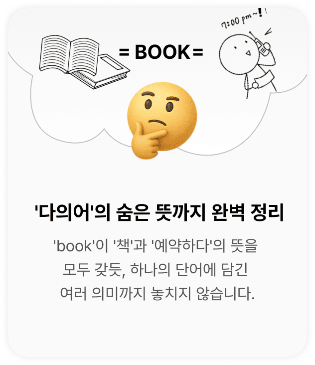 '단어-그림-뜻'을 하나의 장면으로 연결하는 연상 학습은 뇌가 정보를 더 쉽게 인출하도록 돕는 가장 효과적인 방법입니다. 톡이즈 보카는 모든 단어를 살아있는 장면으로 제시하여, 억지로 외우지 않아도 머릿속에 각인되는 놀라운 경험을 선사합니다.